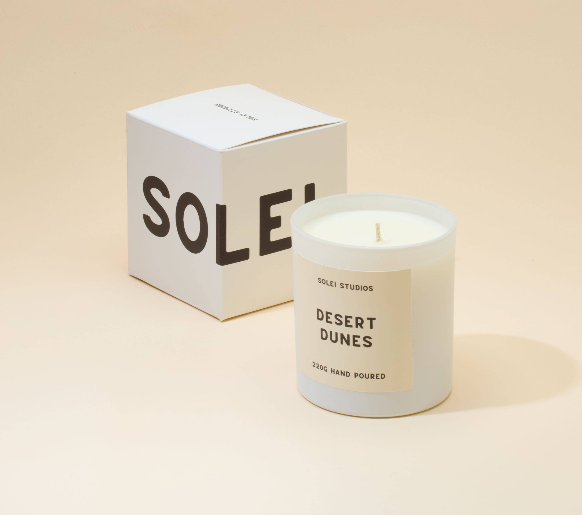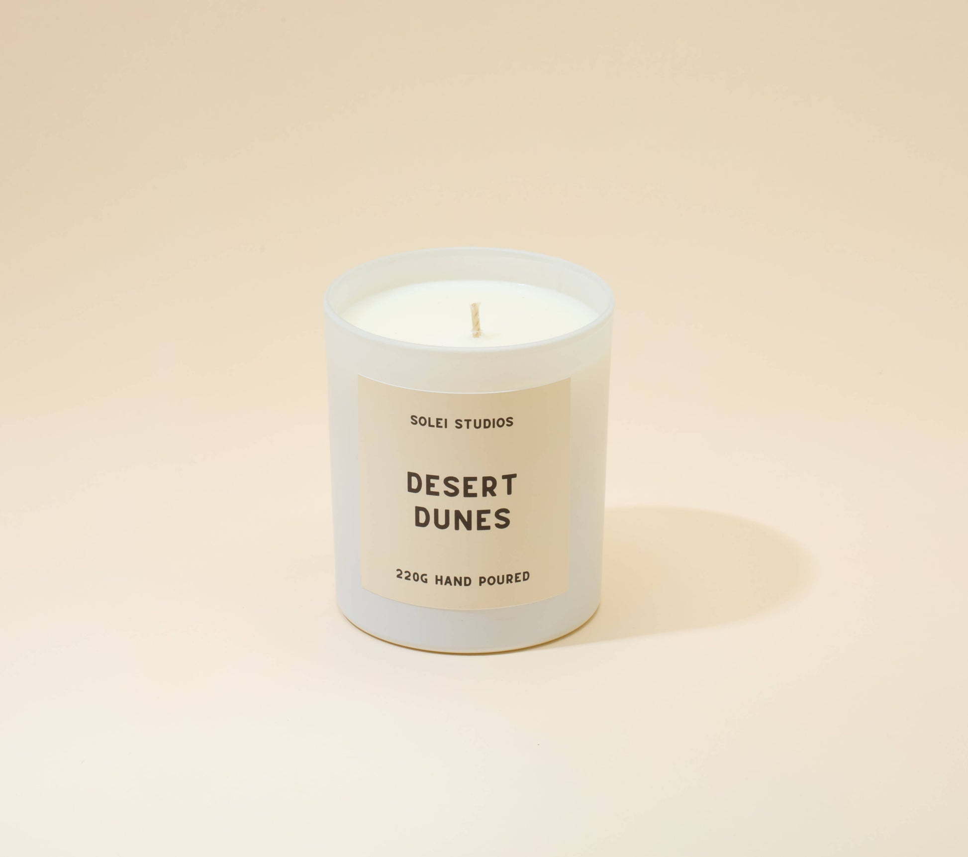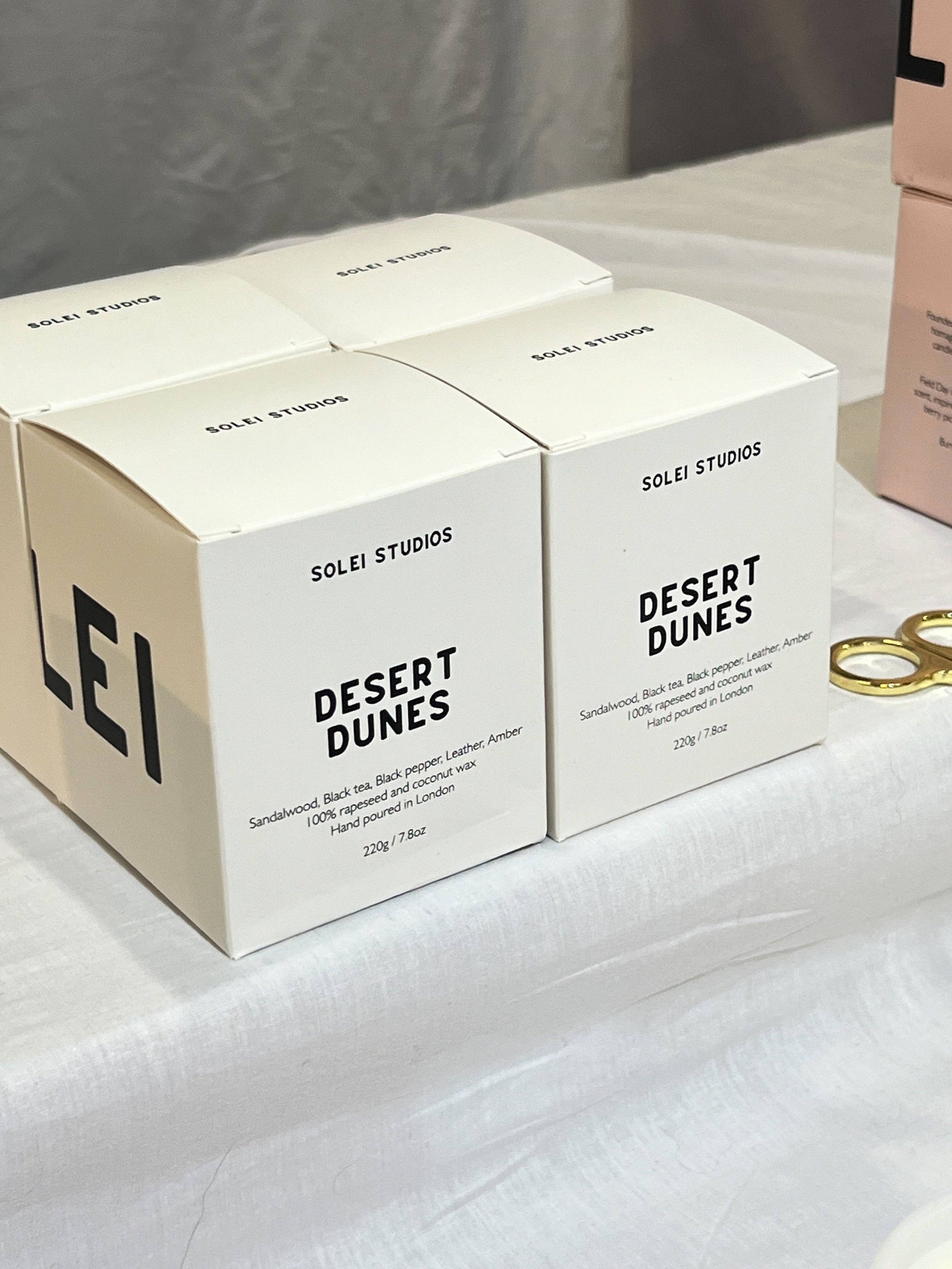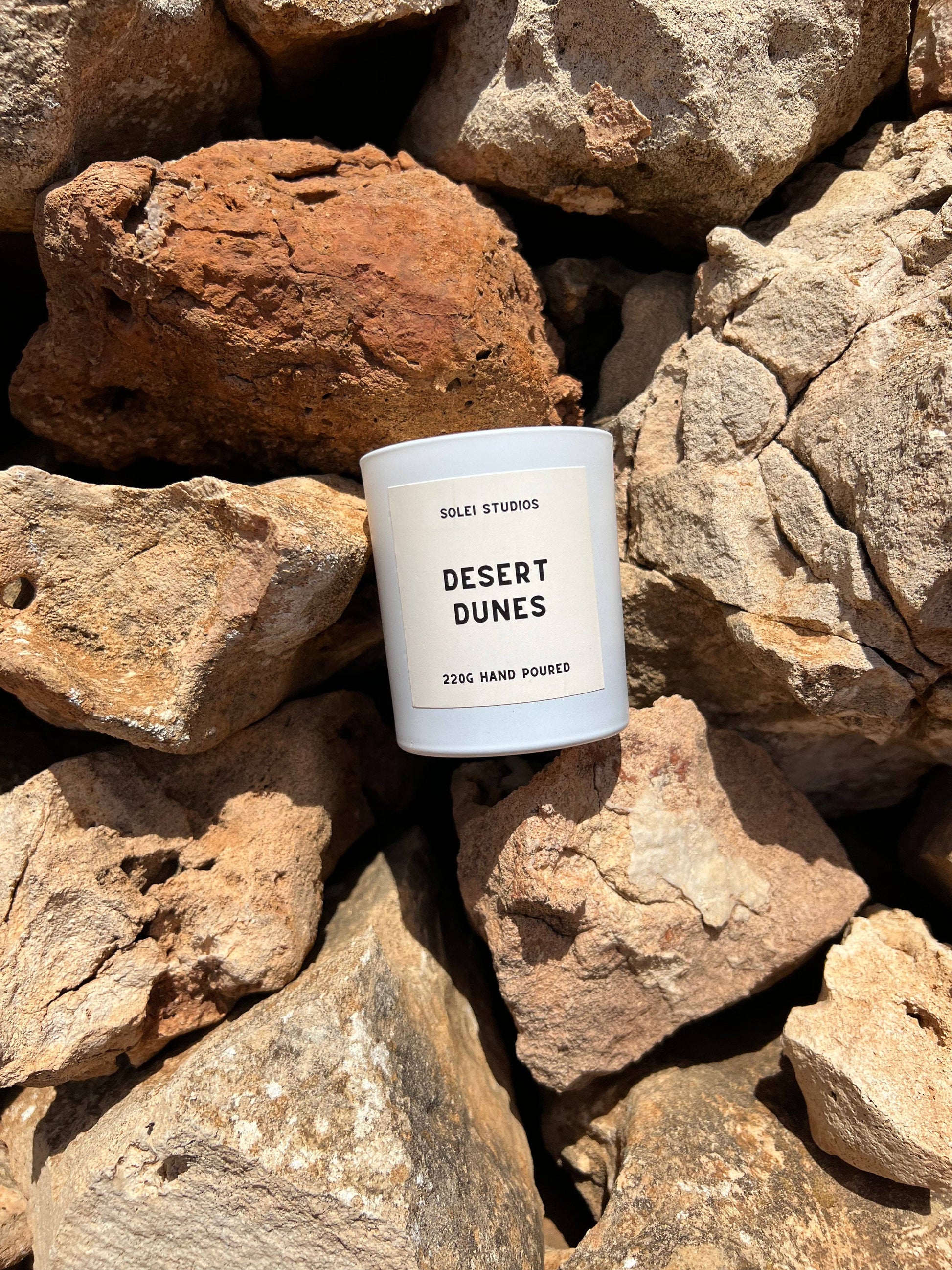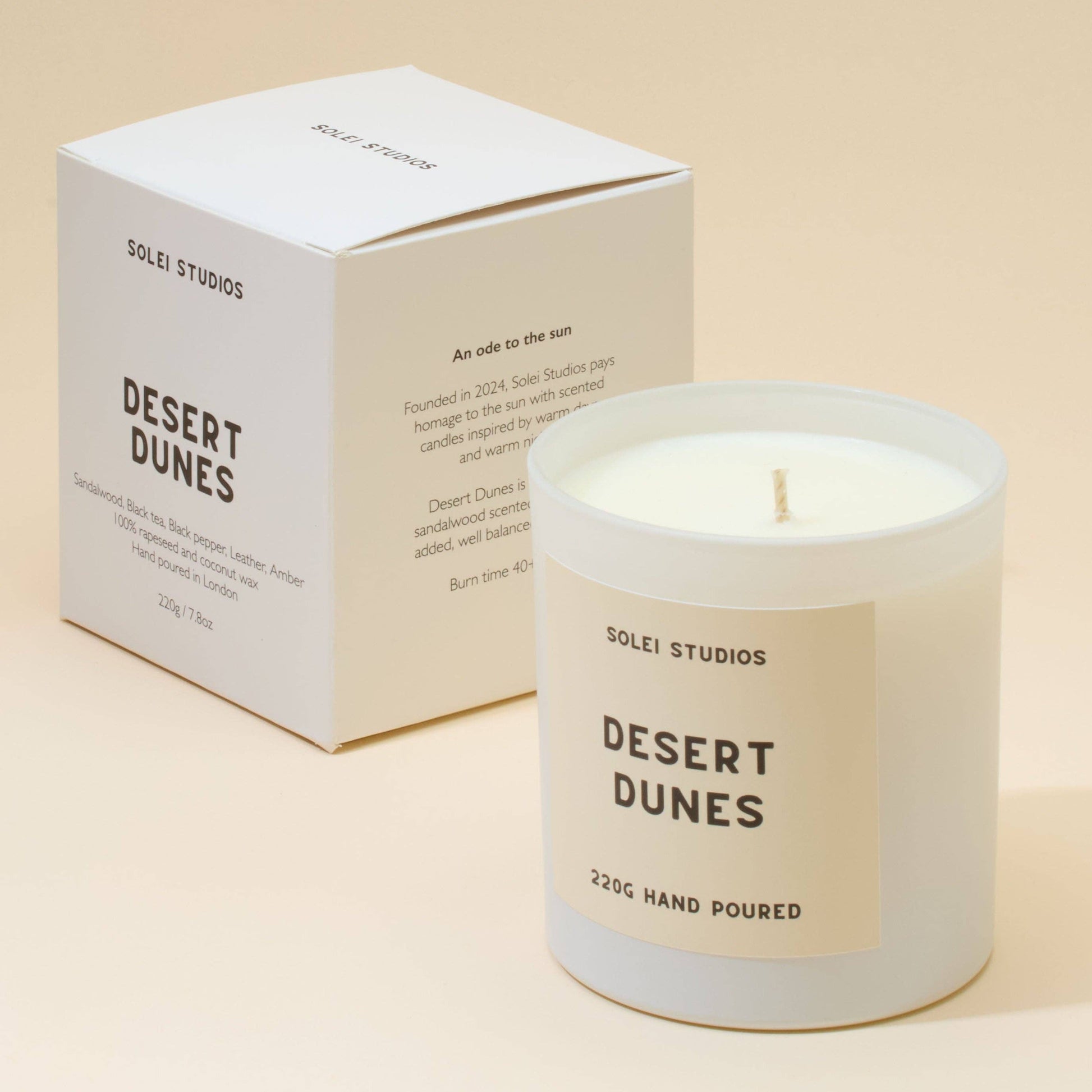 Scent notes: Sandalwood, Black Tea, Black Pepper, Leather, Amber Desert Dunes is a sophisticated, sandalwood scent with added well balanced spice notes. A stand-out fragrance for any time of the year. Details: - Burn time: 40 hours - Wax: Coconut & Rapeseed wax - Hand poured in SE London