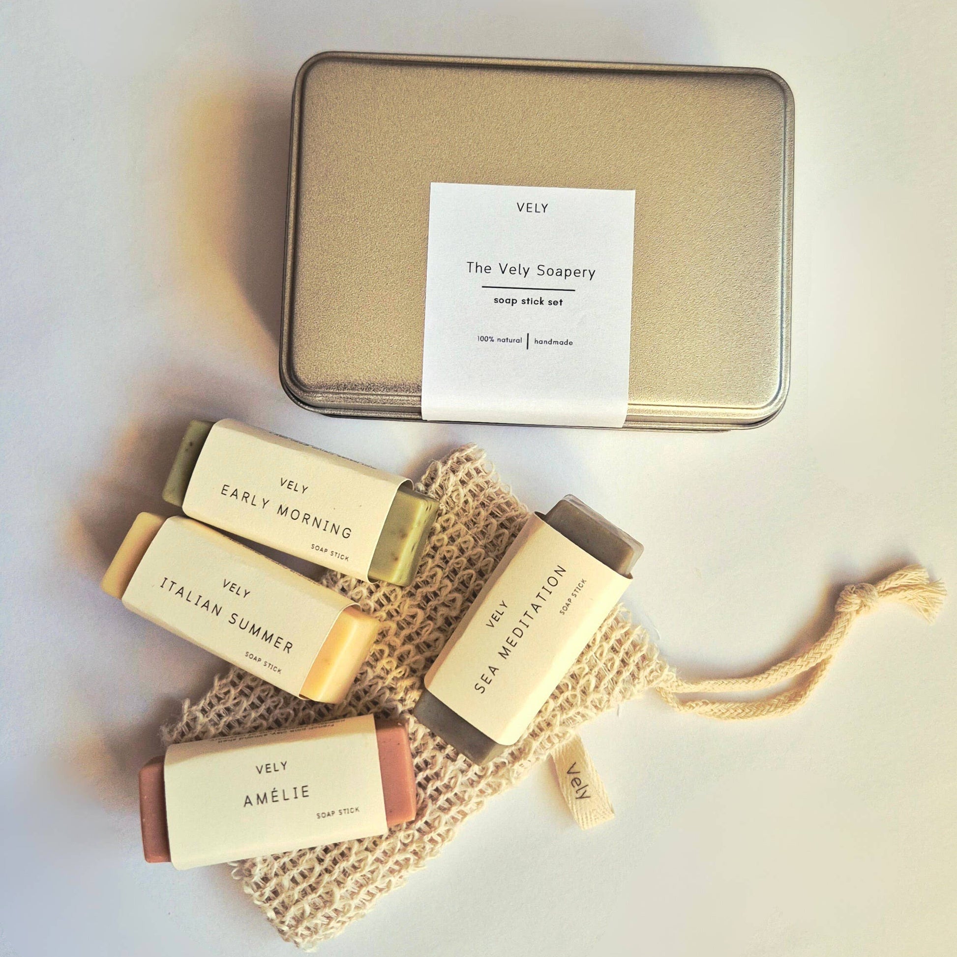 The set comes with a convenient storage tin box and a sisal soap bag, great for light exfoliation in the shower with the chosen soap.
