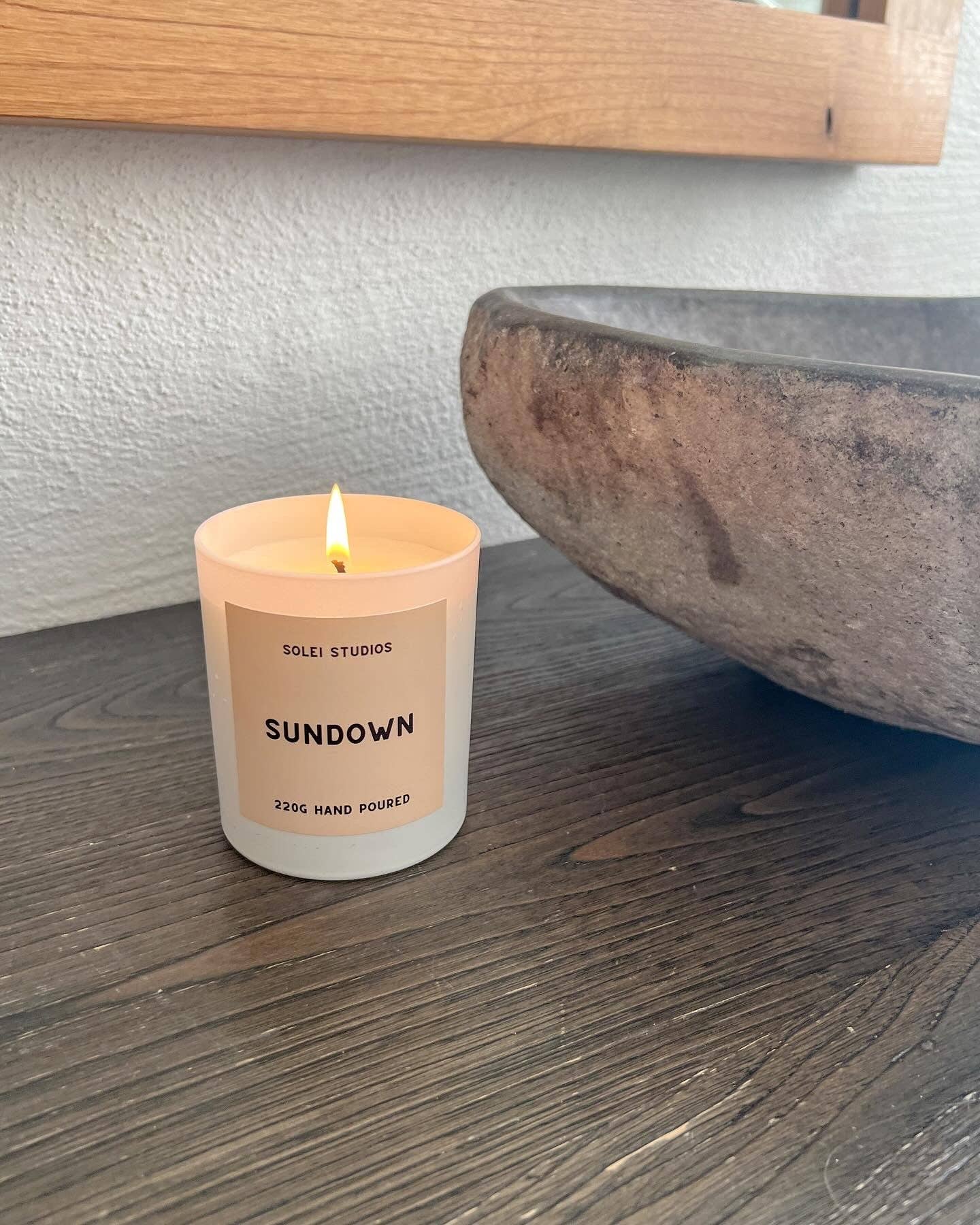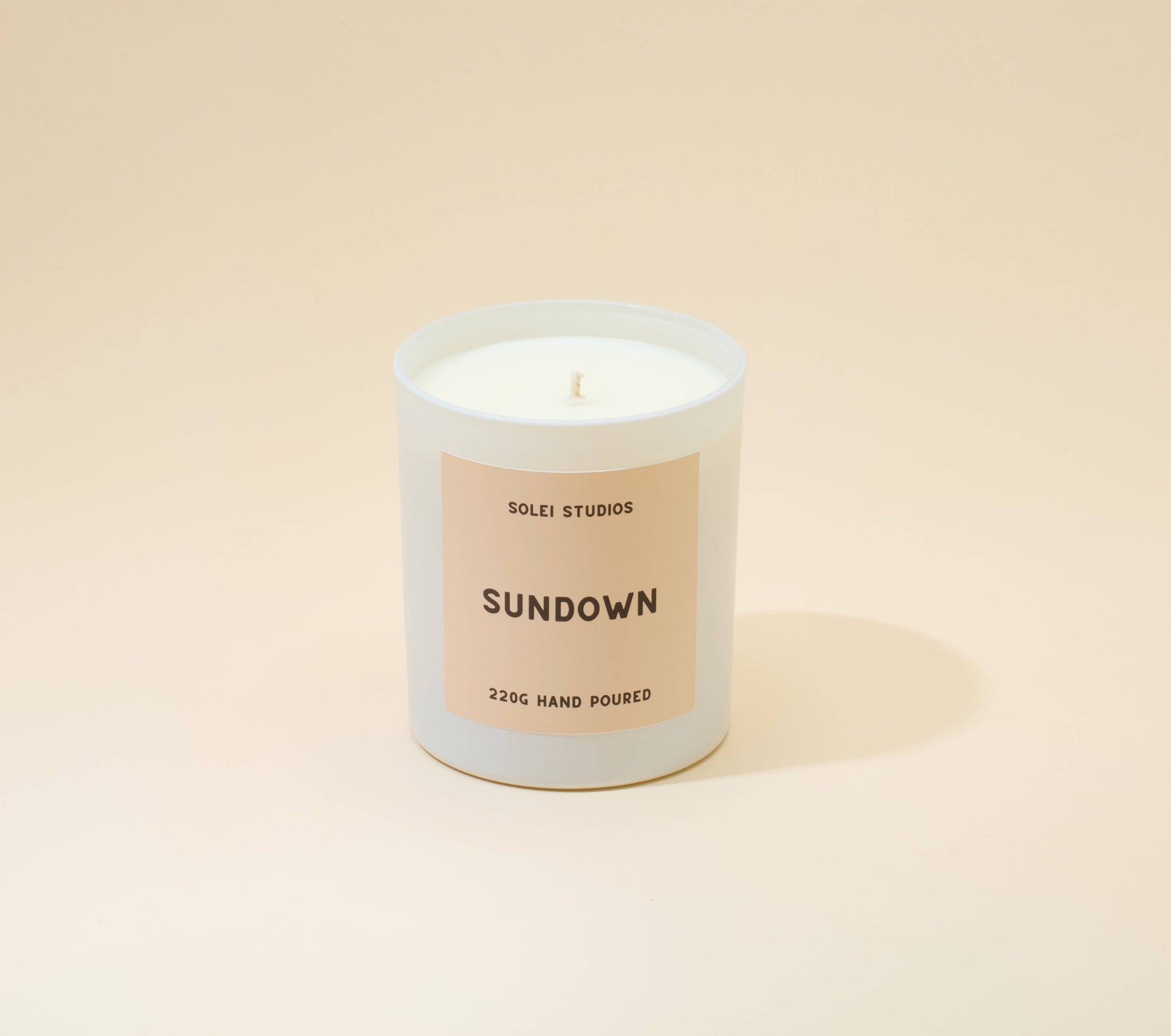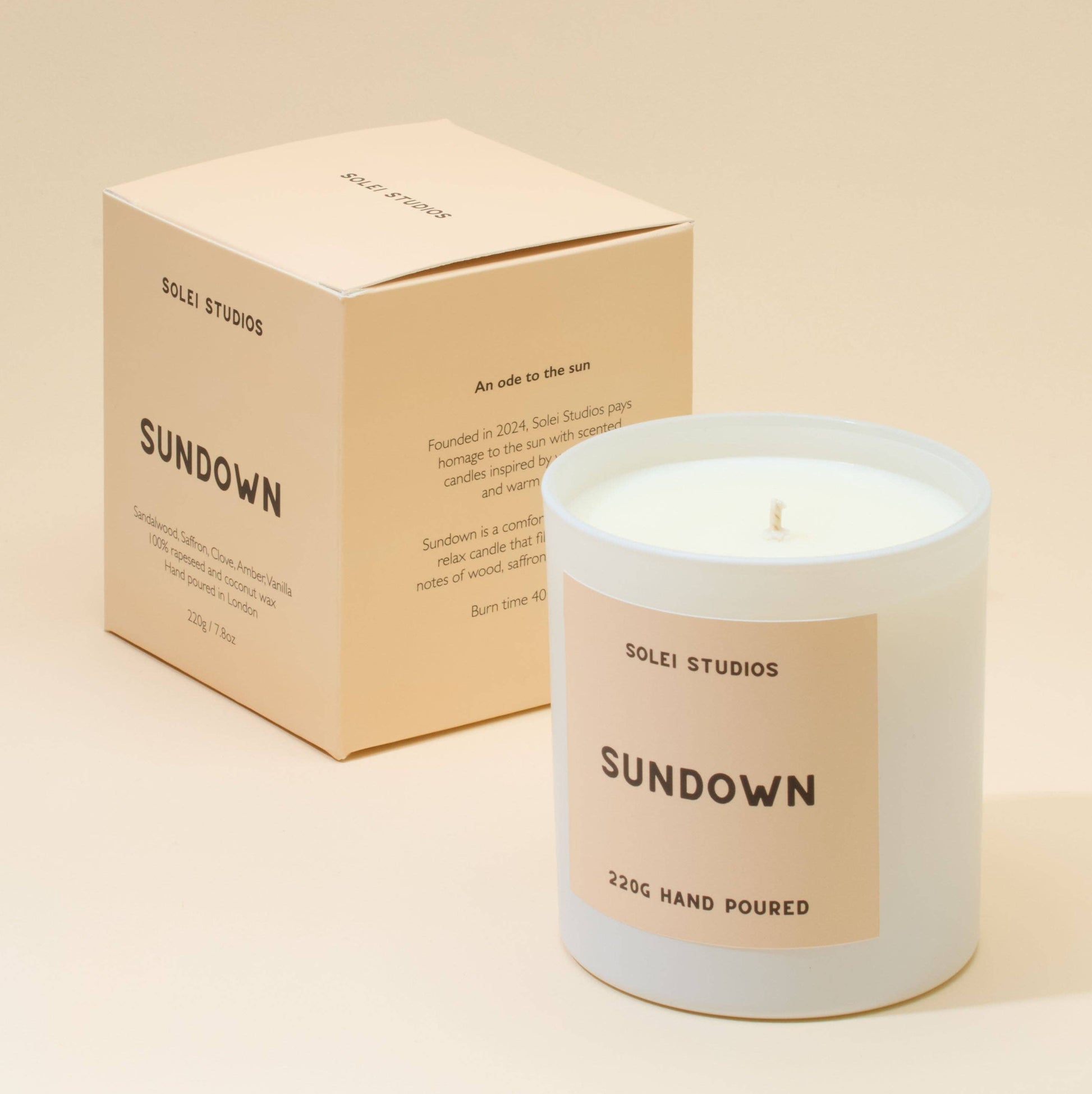 Scent notes: Sandalwood, Saffron, Clove, Vanilla, Amber Sundown is our much beloved cosy and comforting candle. A great evening scent that's a 'safe buy' - it's done really well with our stockists and direct customers. Details: - Burn time: 40 hours - Wax: Coconut & Rapeseed wax - Hand poured in SE London